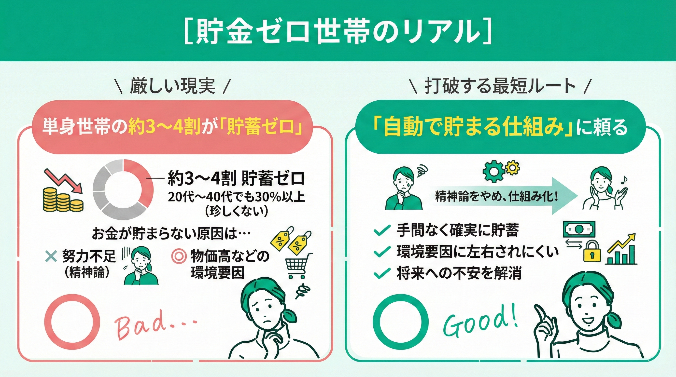 今の時代、貯蓄ゼロは決して恥ずかしいことではありません。まずは現状を冷静に受け止め、感情ではなく「仕組み」で解決しましょう。