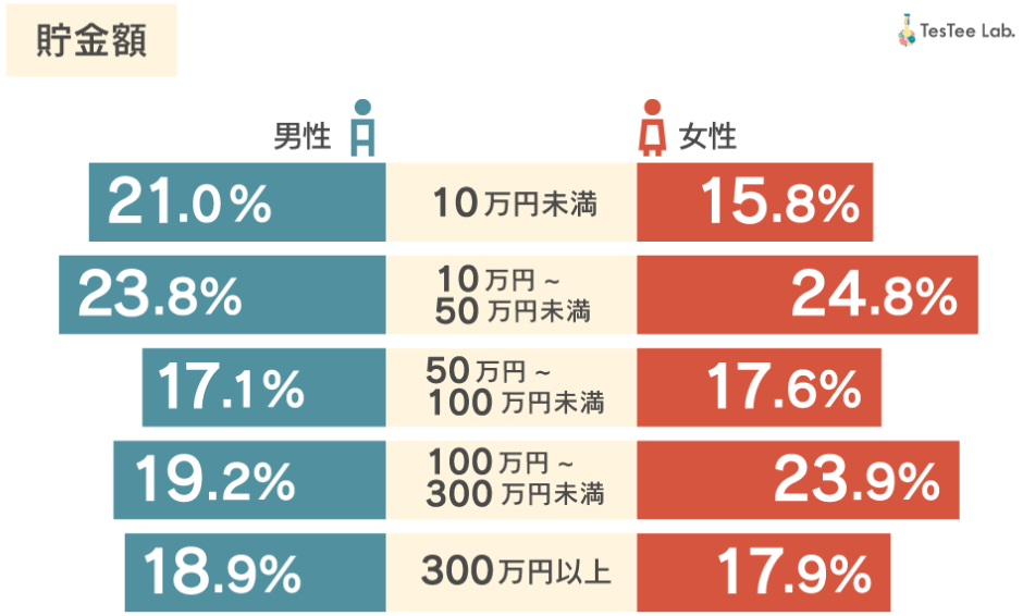 また、貯金額については「10万円~50万円未満」と答えた人が最も多く(女性の24.8%)、次いで「100万円~300万円未満」(女性の23.9%)となりました。