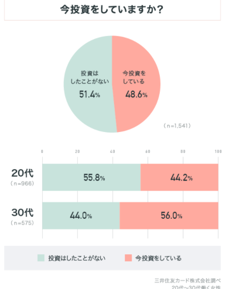 三井住友カードの調査によると、働く20代女性で投資をしているのは44.2%となっています。