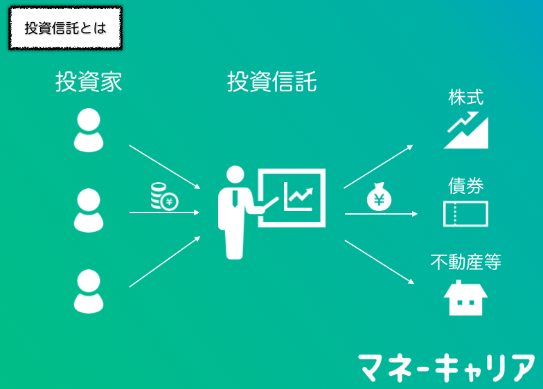 投資信託とは、株式や債券、不動産などの投資先に、運用のプロが投資家の資金で投資・運用する商品です。
